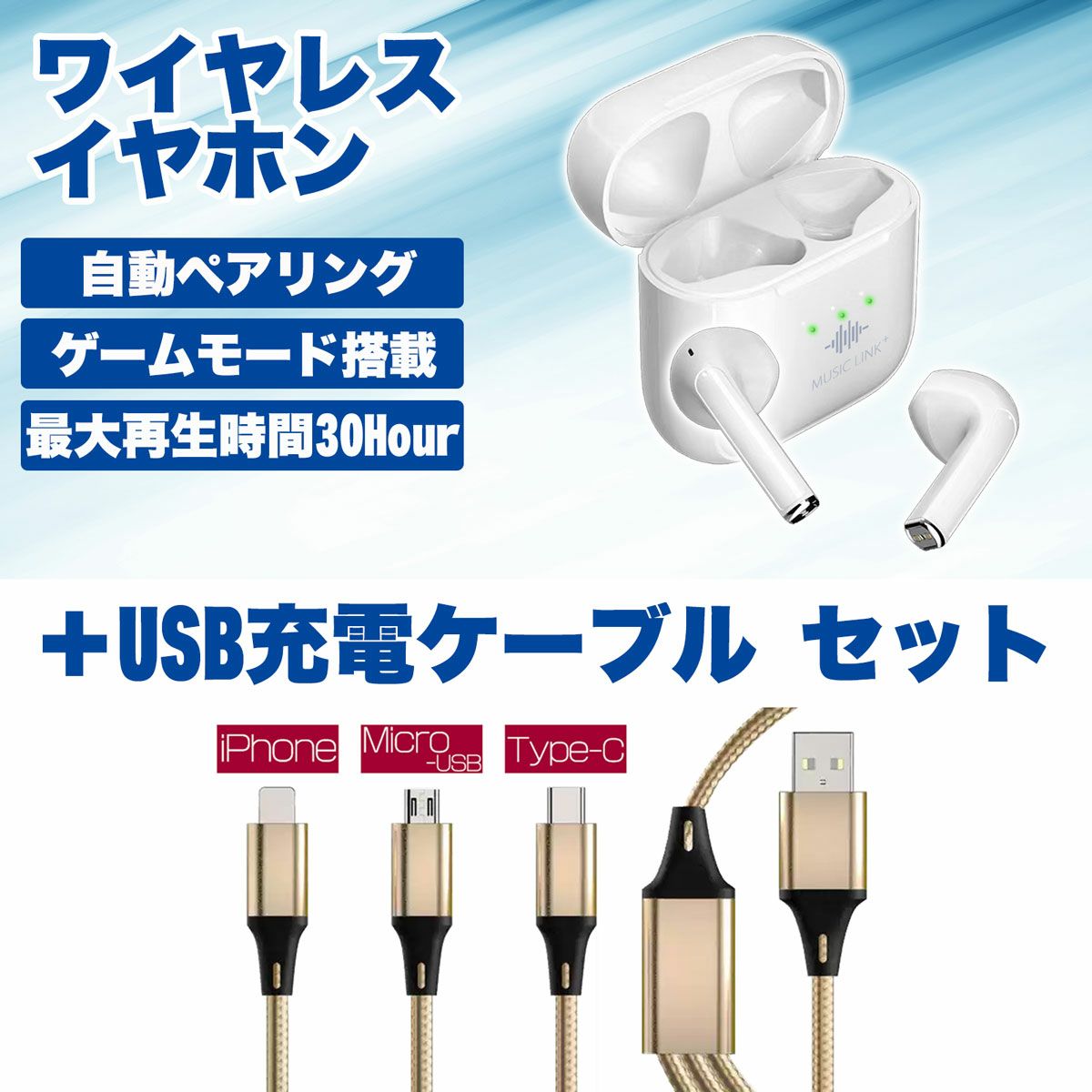 Bluetoothワイヤレスイヤホン+USBケーブルセット